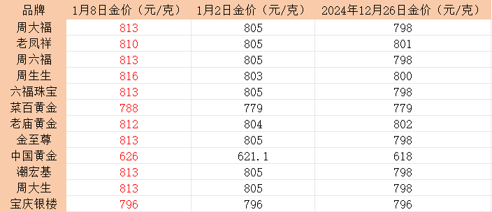 周大福黄金价格:813元/克;老凤祥黄金价格:810元/克;