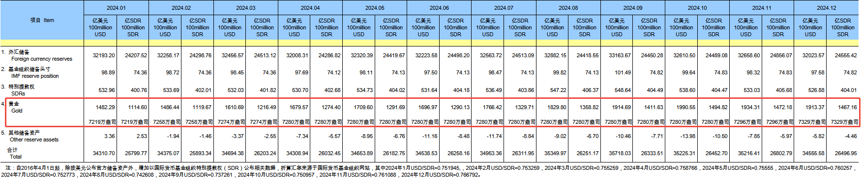 根据央行1月7日公布的数据显示,截至2024年12月末,中国2024年12月末黄金储备报7329万盎司(约2279.57吨),环比增加33万盎司(约10.26吨),11月末为7296万盎司(约2269.31吨)。